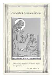 Na tyle obrazka przyklejona blaszka z życzeniami dla dziecka z okazji I Komunii Świętej-