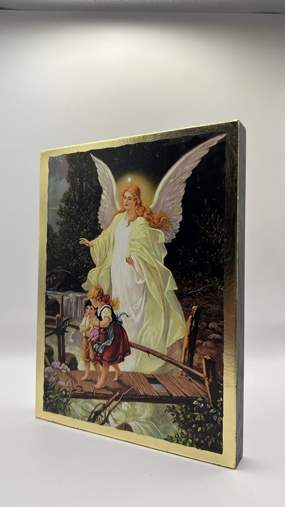 Ikona Anioła Stróża - wykonana techniką unikalnego nadruku na desce ręcznie złocona złotymi płatkami.