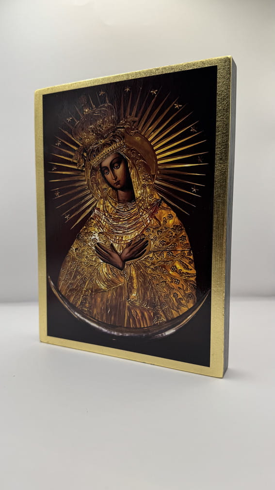 Ikona Matki Bożej Ostrobramskiej - wykonana techniką unikalnego nadruku na desce ręcznie złocona złotymi płatkami.