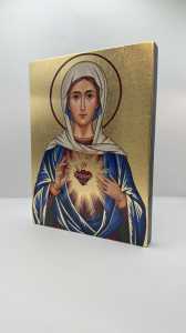 Ikona serca Matki Bożej - wykonana techniką unikalnego nadruku na desce ręcznie złocona złotymi płatkami.
