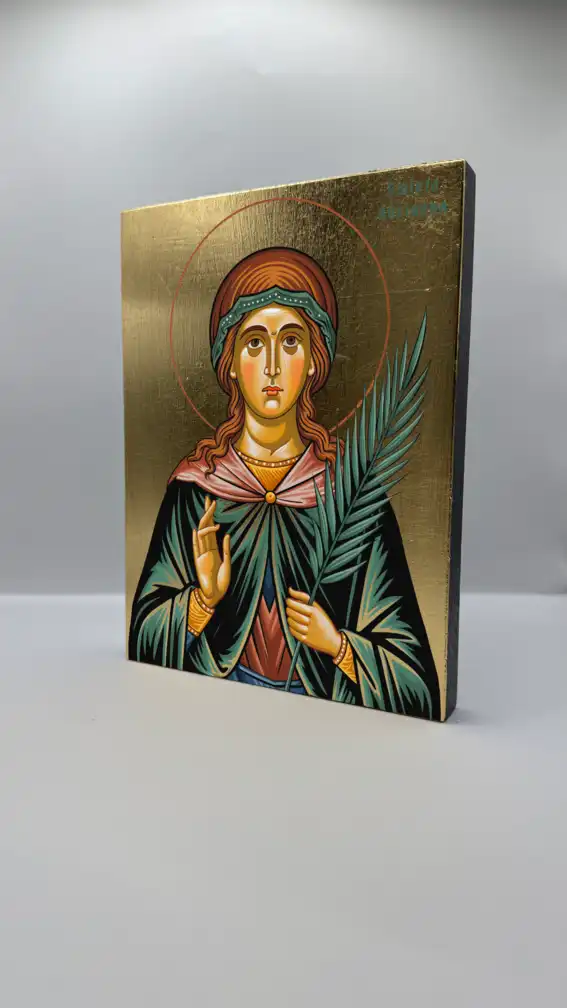 Ikona świętej Adrianny - wykonana techniką unikalnego nadruku na desce ręcznie złocona złotymi płatkami - wzór chroniony prawami autorskimi.