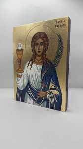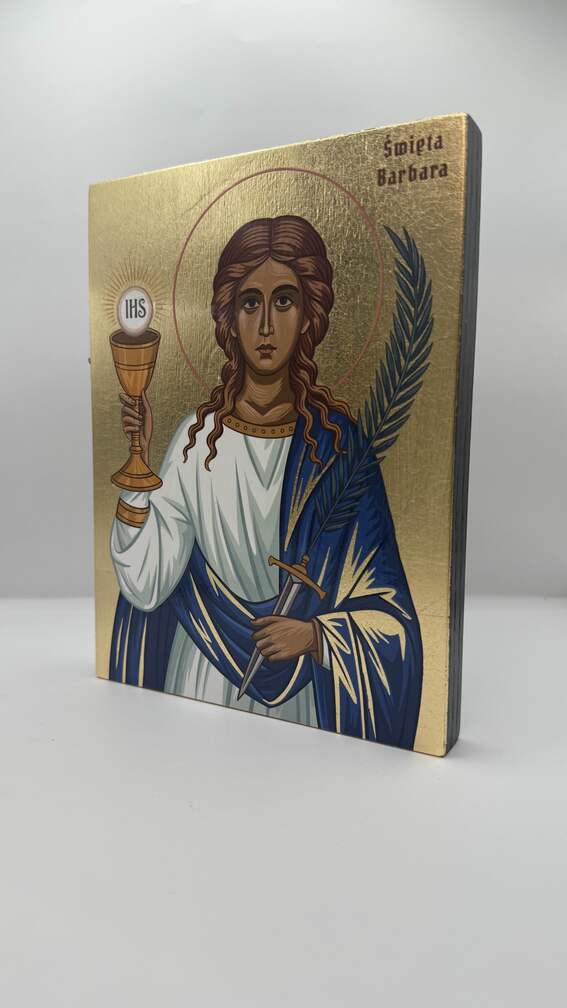 Ikona świętej Barbary - wykonana techniką unikalnego nadruku na desce ręcznie złocona złotymi płatkami - wzór chroniony prawem autorskim.