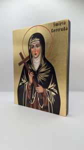 Ikona świętej Gertrudy - wykonana techniką unikalnego nadruku na desce ręcznie złocona złotymi płatkami - wzór chroniony prawem autorskim.