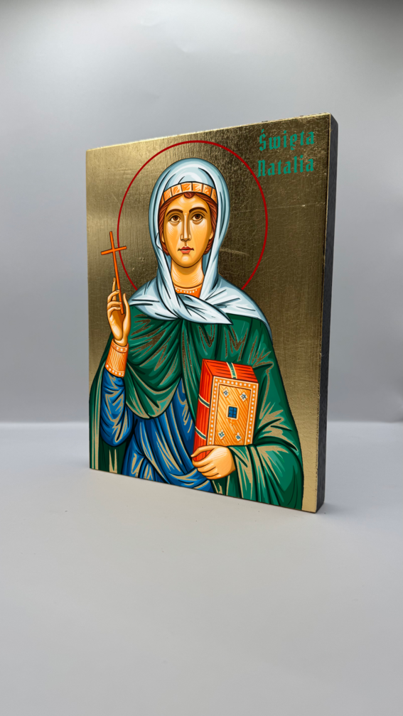 Ikona świętej Natalii - wykonana techniką unikalnego nadruku na desce ręcznie złocona złotymi płatkami.