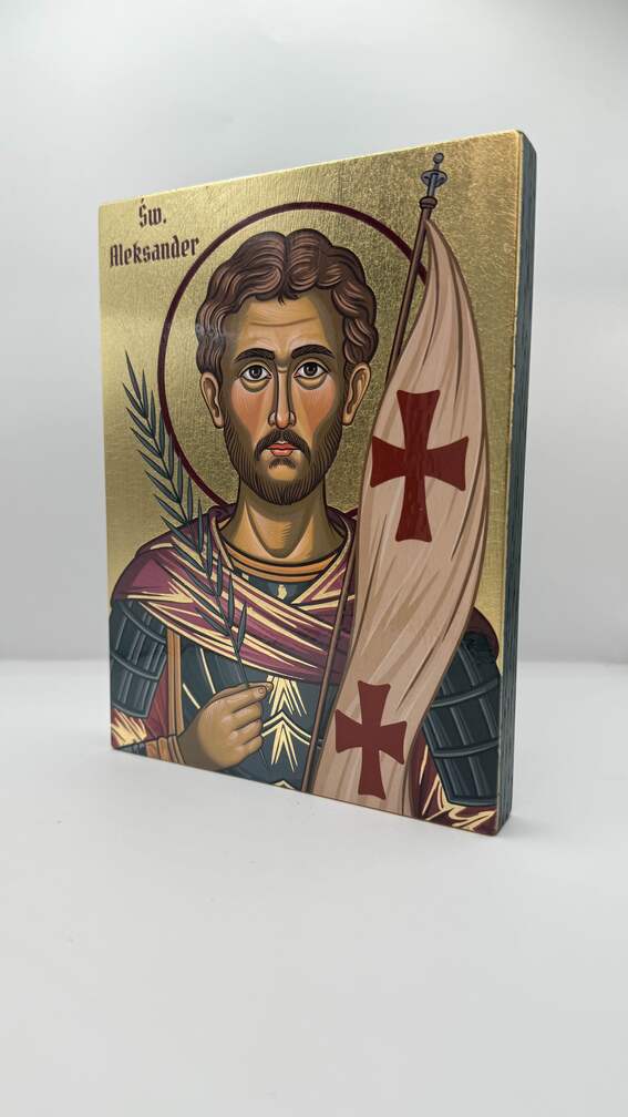 Ikona świętego Aleksandra - wykonana techniką unikalnego nadruku na desce ręcznie złocona złotymi płatkami - wzór chroniony prawem autorskim.