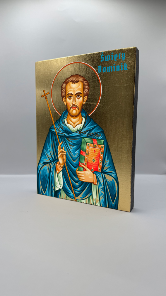 Ikona świętego Dominika Guzmana - wykonana techniką unikalnego nadruku na desce ręcznie złocona złotymi płatkami.