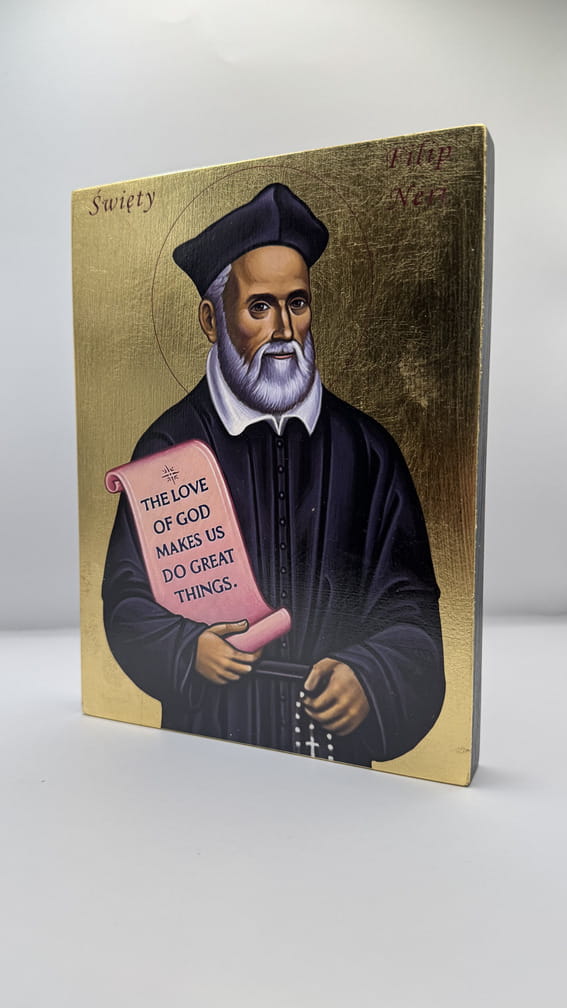 Ikona świętego Filipa Neri - wykonana techniką unikalnego nadruku na desce ręcznie złocona złotymi płatkami.
