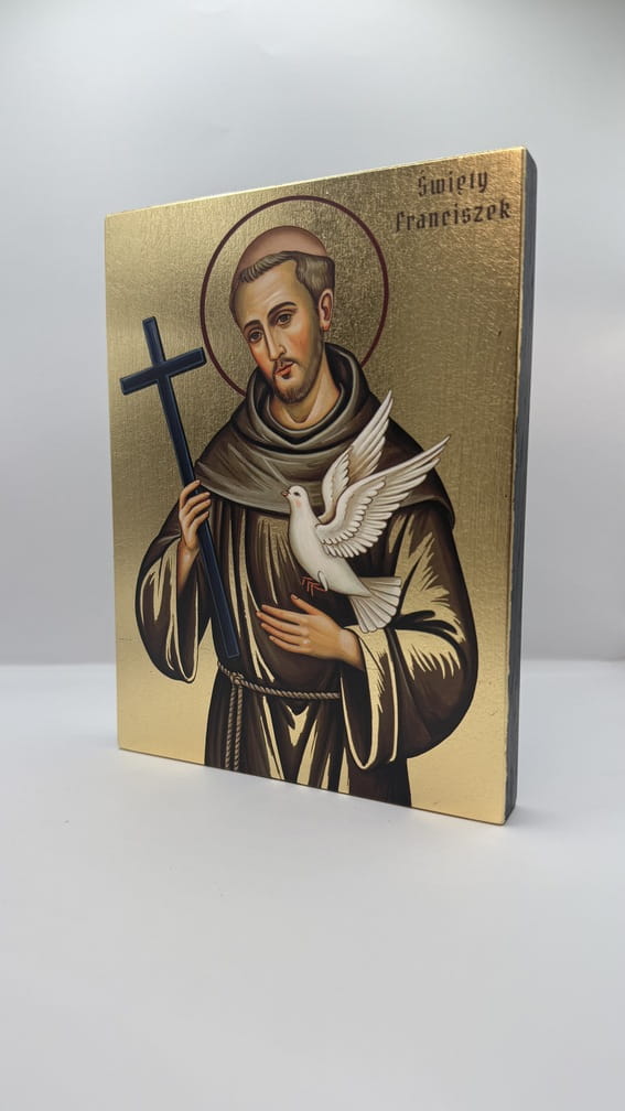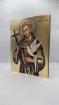 Ikona świętego Franciszka - wykonana techniką unikalnego nadruku na desce ręcznie złocona złotymi płatkami.