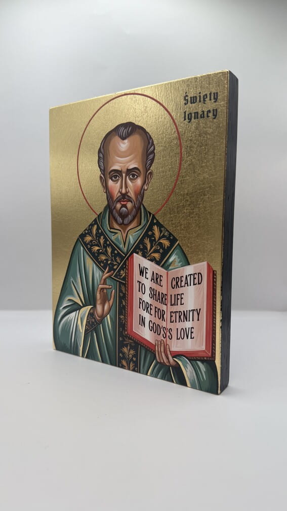 Ikona świętego Ignacego Loyoli - wykonana techniką unikalnego nadruku na desce ręcznie złocona złotymi płatkami.