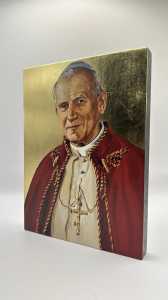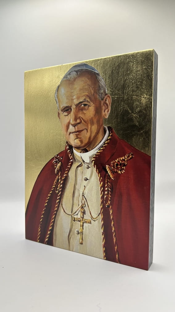 Ikona świętego Jana Pawła II - wykonana techniką unikalnego nadruku na desce ręcznie złocona złotymi płatkami.