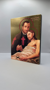 Ikona świętego Kamila De Lellis - wykonana techniką unikalnego nadruku na desce ręcznie złocona złotymi płatkami.