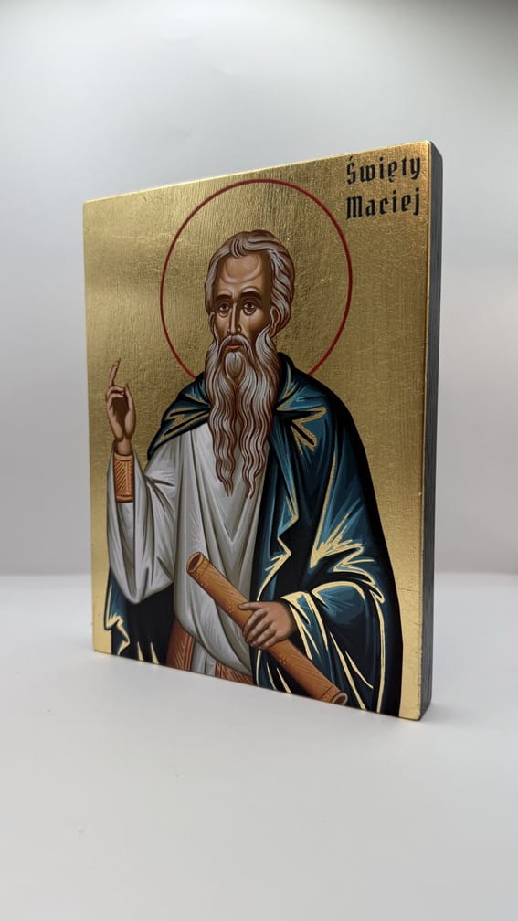 Ikona świętego Macieja - wykonana techniką unikalnego nadruku na desce ręcznie złocona złotymi płatkami.
