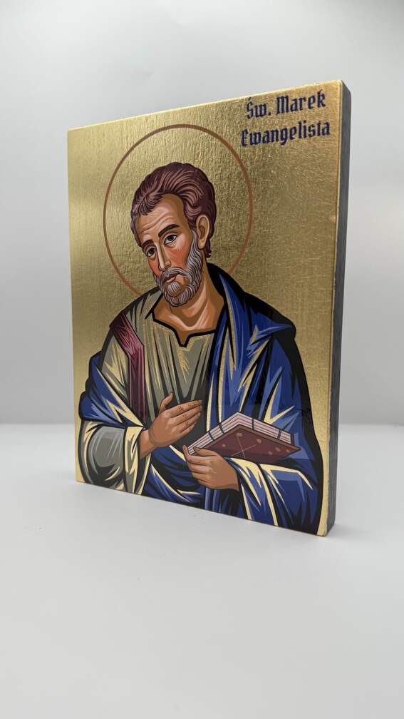 Ikona świętego Marka Ewangelisty - wykonana techniką unikalnego nadruku na desce ręcznie złocona płatkami złota - wzór chroniony prawem autorskim.