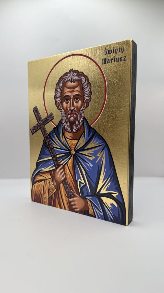 Ikona świętego Mariusza - wykonana techniką unikalnego nadruku na desce ręcznie złocona złotymi płatkami.
