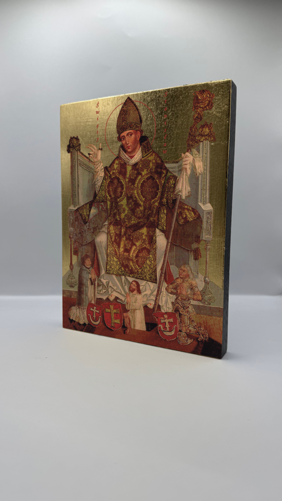 Ikona świętego Stanisława - wykonana techniką unikalnego nadruku na desce ręcznie złocona złotymi płatkami.