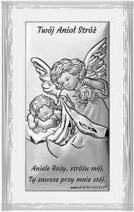 Obraz srebrny przedstawiający Aniołka z latarenką nad dzieckiem z napisem Pamiątka Chrztu Świętego i wezwaniem do Anioła Stróża.
