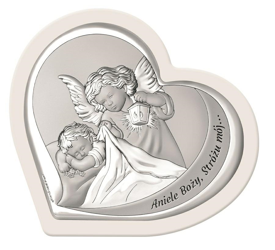 Obraz srebrny przedstawiający Aniołka z latarenką nad dzieckiem z napisem Aniele Boży Stróżu mój...