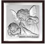 Obraz srebrny przedstawiający Aniołka z latarenką nad dzieckiem z napisem Pamiątka Chrztu Świętegona drewnianym podkładzie tworzy elegancką ramkę wokół wizerunku.