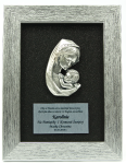 Obraz przedstawiający Matkę Bożą trzymająca na ręku Pana Jezusa. Wizerunek Matki Bożej odlewany w metalu wykonany we Włoszech.