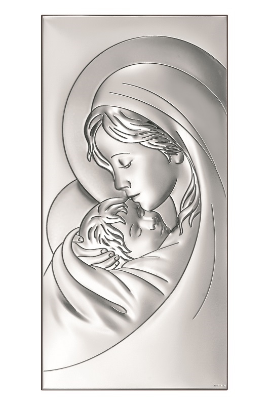 Pasuje do każdego domu. Wykonany z laminatu aluminiowego pokryty srebrem wizerunek Matki Bożej z Dzieciątkiem pasuje szczególnie do nowoczesnego wnętrza.