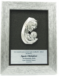 Obraz przedstawiający Świętą Rodzinę Matkę Bożą trzymająca na ręku Pana Jezusa z tyłu Święty Józef. Wizerunek odlewany w metalu wykonany we Włoszech.