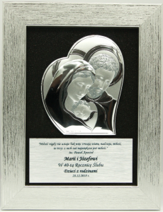 Obraz przedstawiający Świętą Rodzinę Matkę Bożą trzymająca na ręku Pana Jezusa z tyłu Święty Józef. Wizerunek wykonany z laminatu pokryty wysokiej jakości srebrem wykonany we Włoszech. Grawer wykonany jest na aluminiowym podkładzie. Obrazek świętej Rodziny z okazji rocznicy ślubu jest bardzo dobrze oceniany i często wybierany jako prezent na rocznicę ślubu.
