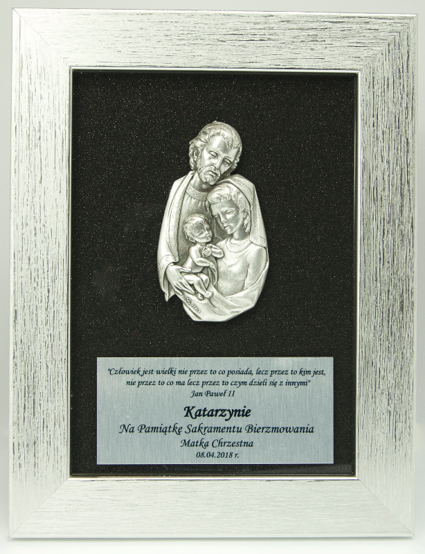 Obraz przedstawiający Świętą Rodzinę Matkę Bożą trzymająca na ręku Pana Jezusa z tyłu czuwa nad nimi Święty Józef. Wizerunek odlewany w metalu wykonany we Włoszech.