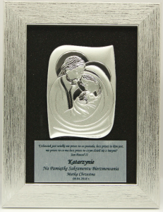 Obraz przedstawiający Świętą Rodzinę Matkę Bożą trzymająca na ręku Pana Jezusa obok Święty Józef. Wizerunek wykonany z laminatu pokryty wysokiej próby srebrem wyprodukowany we Włoszech.