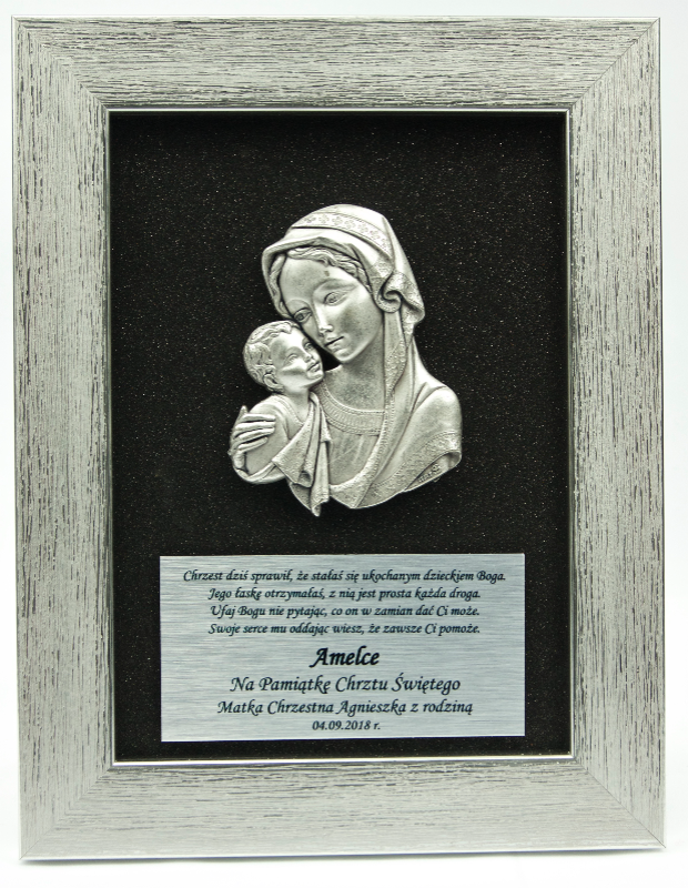 Obrazek Matki bożej z Dzieciątkiem z grawerem na tabliczce to bardzo dobry i tani prezent na chrzest.