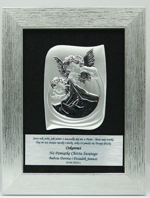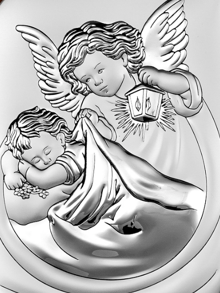 Obrazek ze srebrem Aniołek przykrywający dziecko jest bardzo dobrym wyborem jako prezent z okazji Chrztu Świętego.