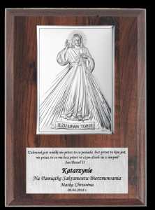 Oferujemy obraz-plakietka przedstawiający wizerunek Jezusa Miłosiernego pokrytego srebrem.