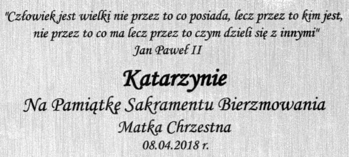 Grawerowana dedykacja poniżej wizerunku nadaje całości indywidualny i niepowtarzalny charakter i jest bardzo dobrym prezentem z okazji bierzmowania.