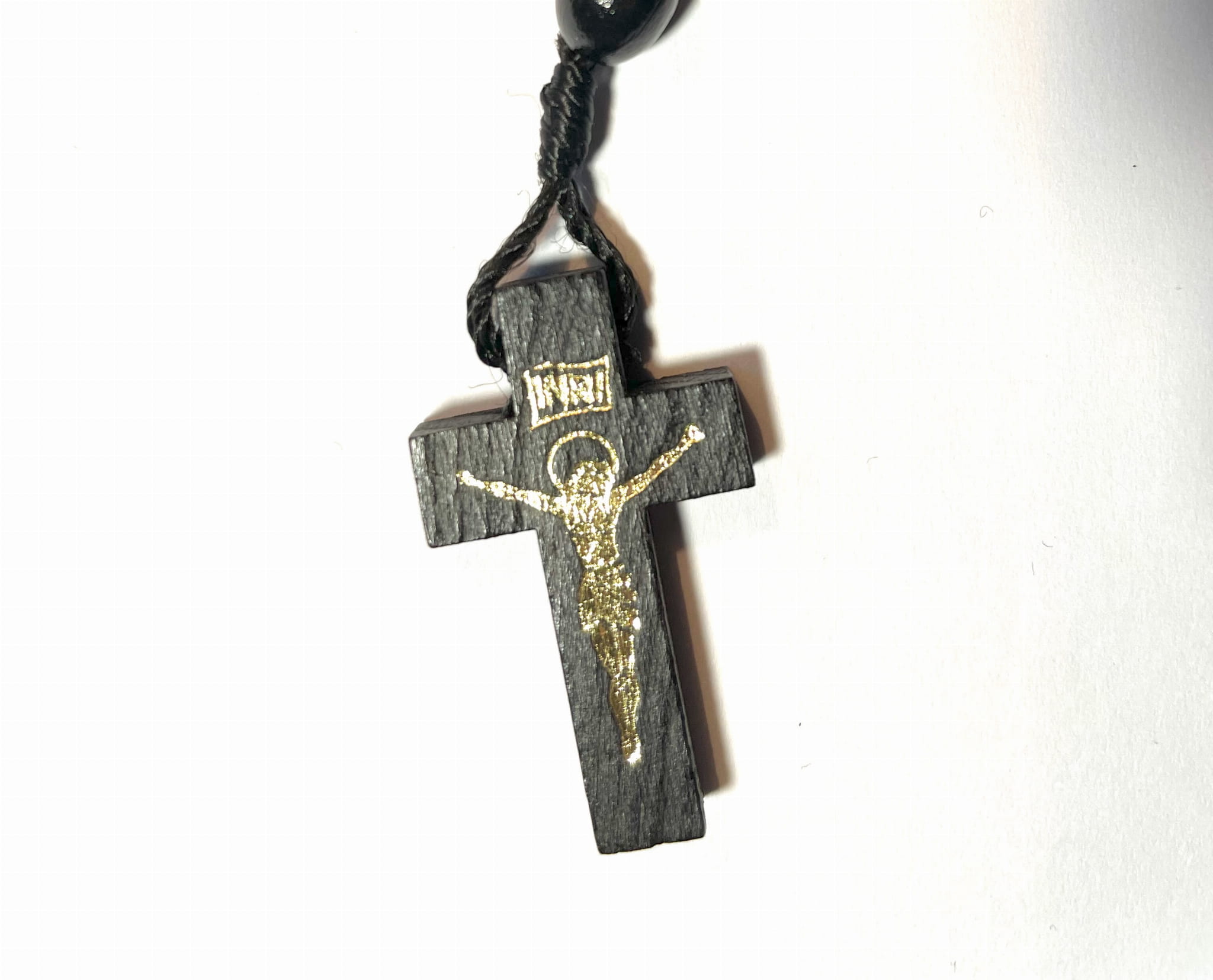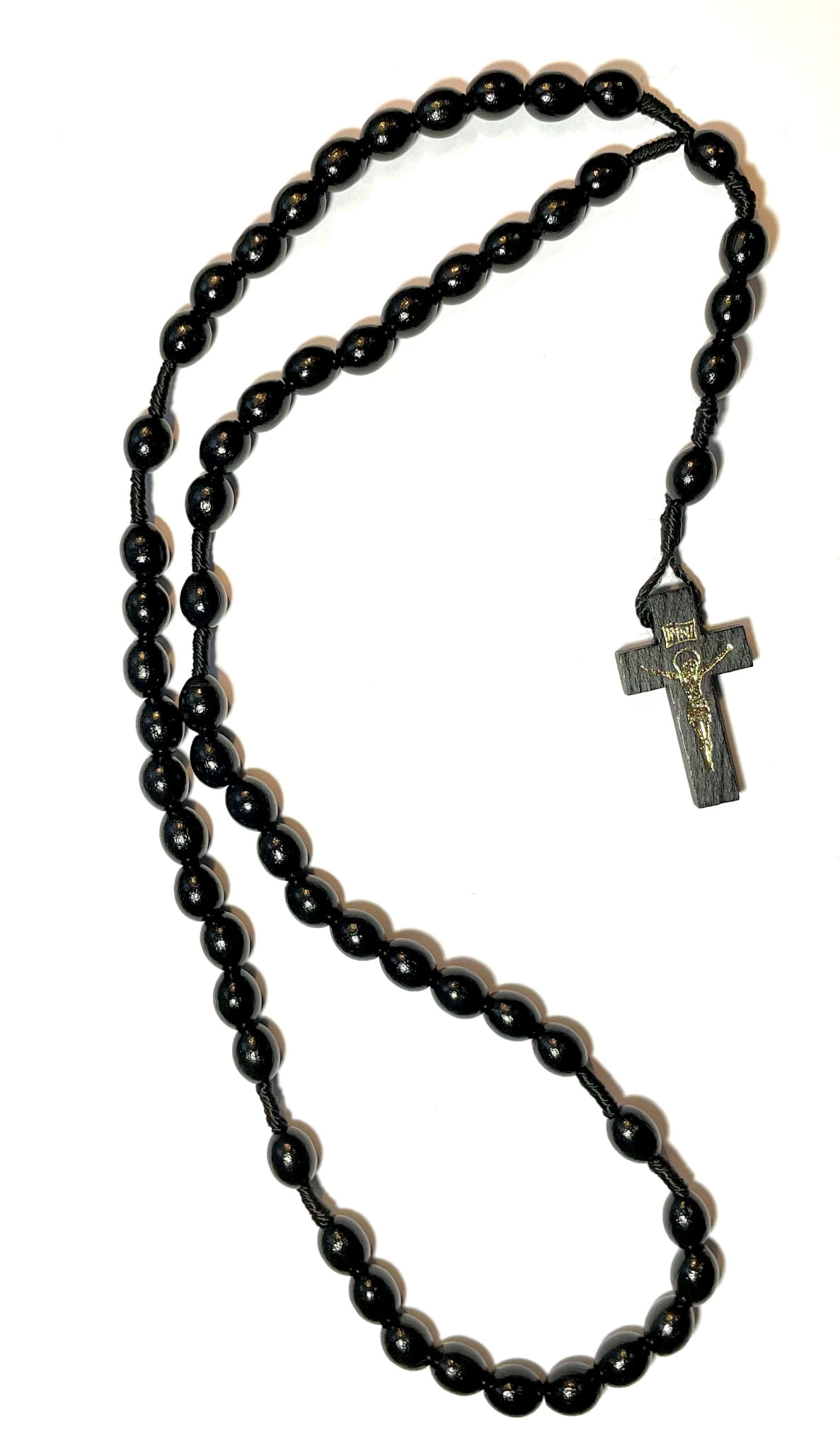 Różaniec drewniany na sznurku w kolorze czarnym.