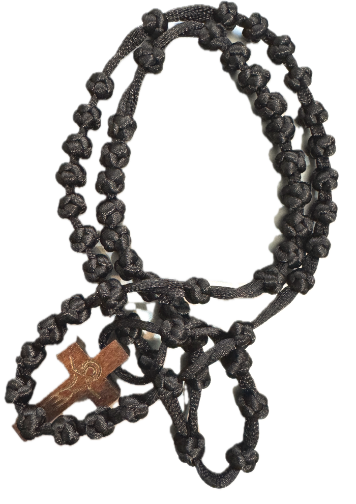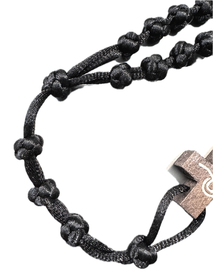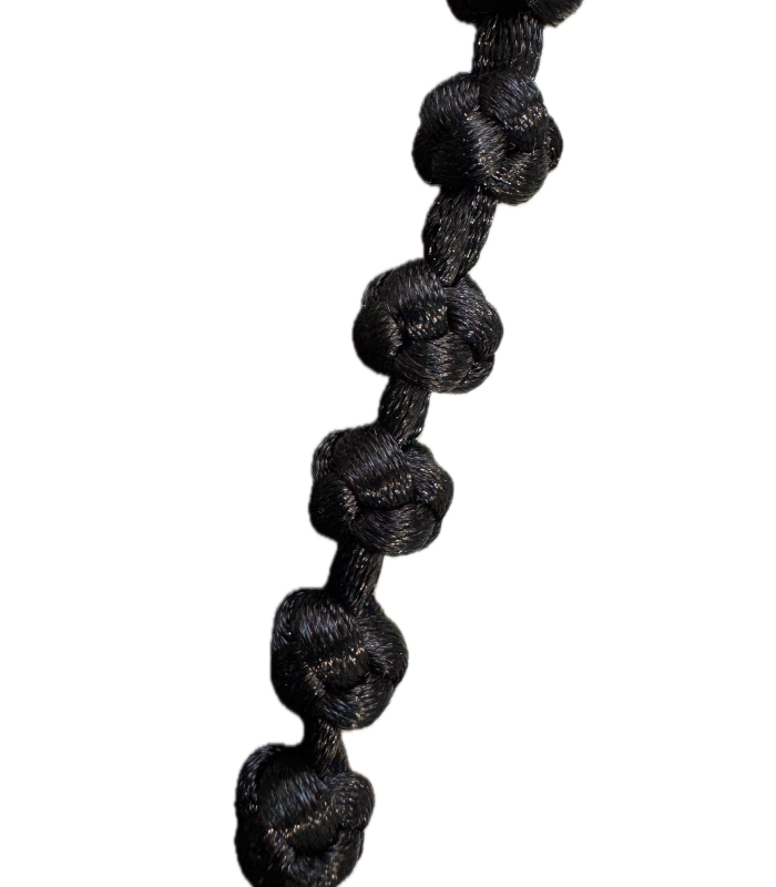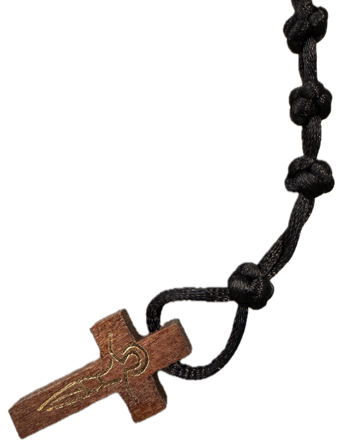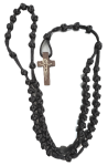 Różaniec pleciony ze sznurka w kolorze czarnym z drewnianym krzyżykiem trwały i prosty.
