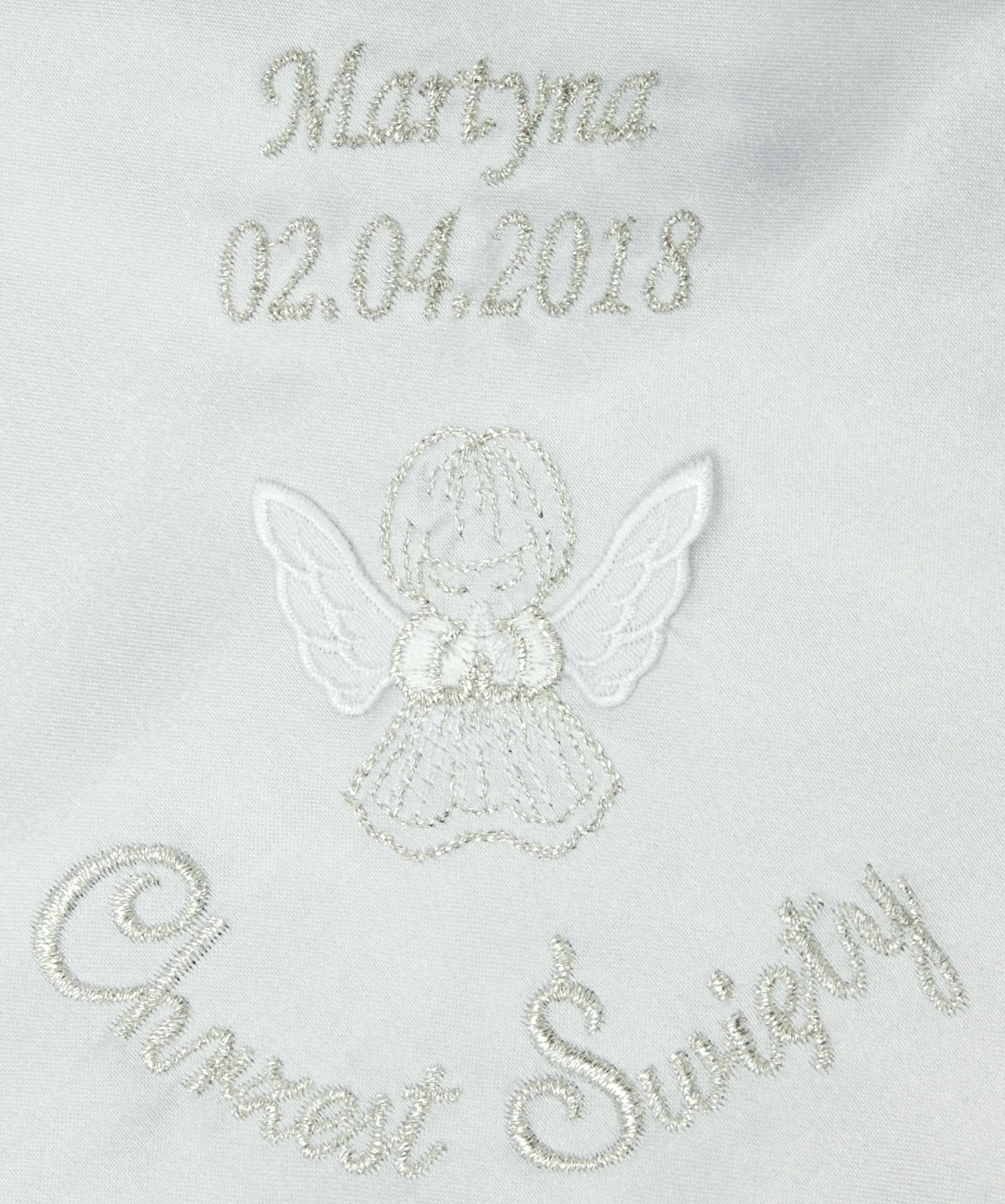 Imiona i data będą wyhaftowane powyżej emblematu aniołka (patrz zdjęcia z przykładami haftu).