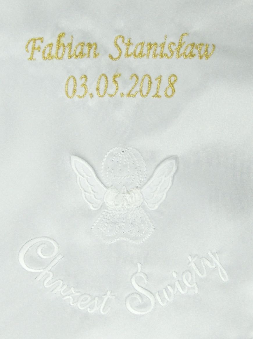 Jest możliwość zamówienia haftu imienia lub imion dziecka oraz daty chrztu świętego.