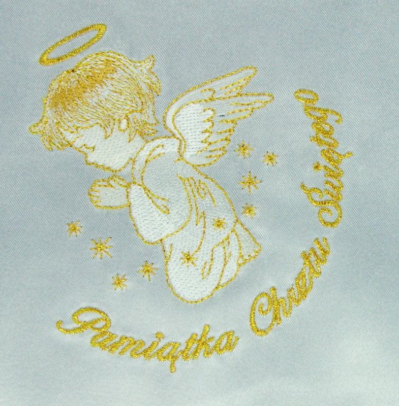 Haft można wykonać w dwóch kolorach złotym i srebrnym nićmi, którymi haftowano emblemat aniołka.